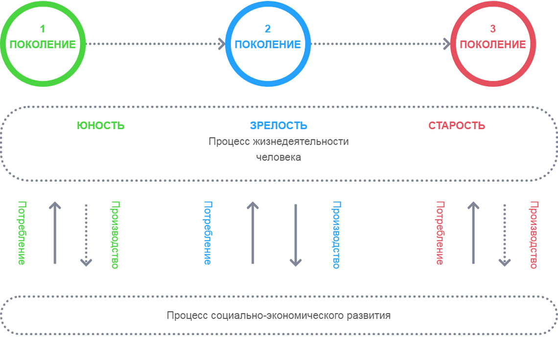 Причем, в фазе юности процесс социально-экономического развития является обеспечивающим для жизнедеятельности человека. В зрелом возрасте индивид генерирует для социально-экономической системы больше благ, чем потребляет. В старости человек вновь в большей степени является потребителем благ социально-экономической системы, нежели производителем.